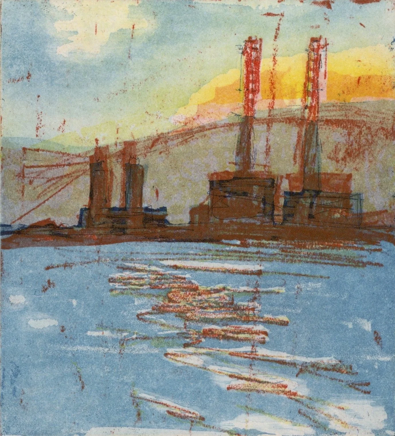 The first two of the series are of the typical views of the towers from either side of Dublin Bay, In Home at Last I we see the Poolbeg Chimneys at sunset from the Clontarf side of the bay. This etching was made towards the end of the pandemic when lock-downs limited where we could go, this one one of the views I most associate with that time. Home at Last II is taken from the other side of the bay, after the restrictions lifted, a year later. In Towers: Palimpsest the worn surfaces and flaking paint of the chimneys have inspired the use of spit-bite and textural resists.